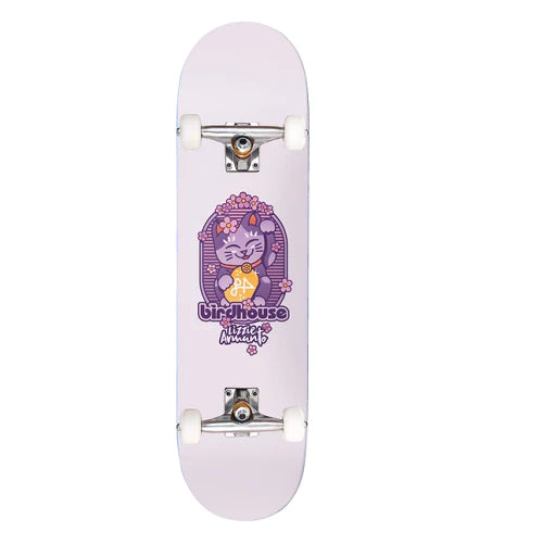 Birdhouse Skateboards complete. Lizzie Armanto's Maneki Neko graphic assembled skateboard. In purple colorway. Size: 8.0 Complete skateboard assembly that’s ready to roll out of the box. Perfect for the beginner, yet offers durable, quality components that even an accomplished skater would love.