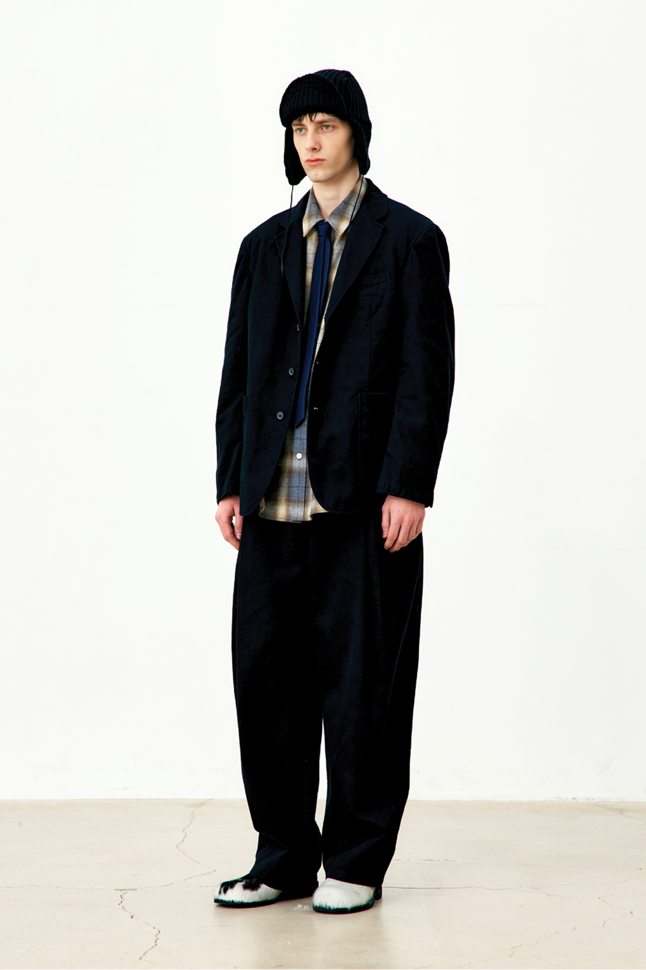 An oversized balloon-fit trouser designed with deep double pleats for volume and structure. Finished with garment washing for a natural hand feel, this piece blends comfort, movement, and refined detailing.