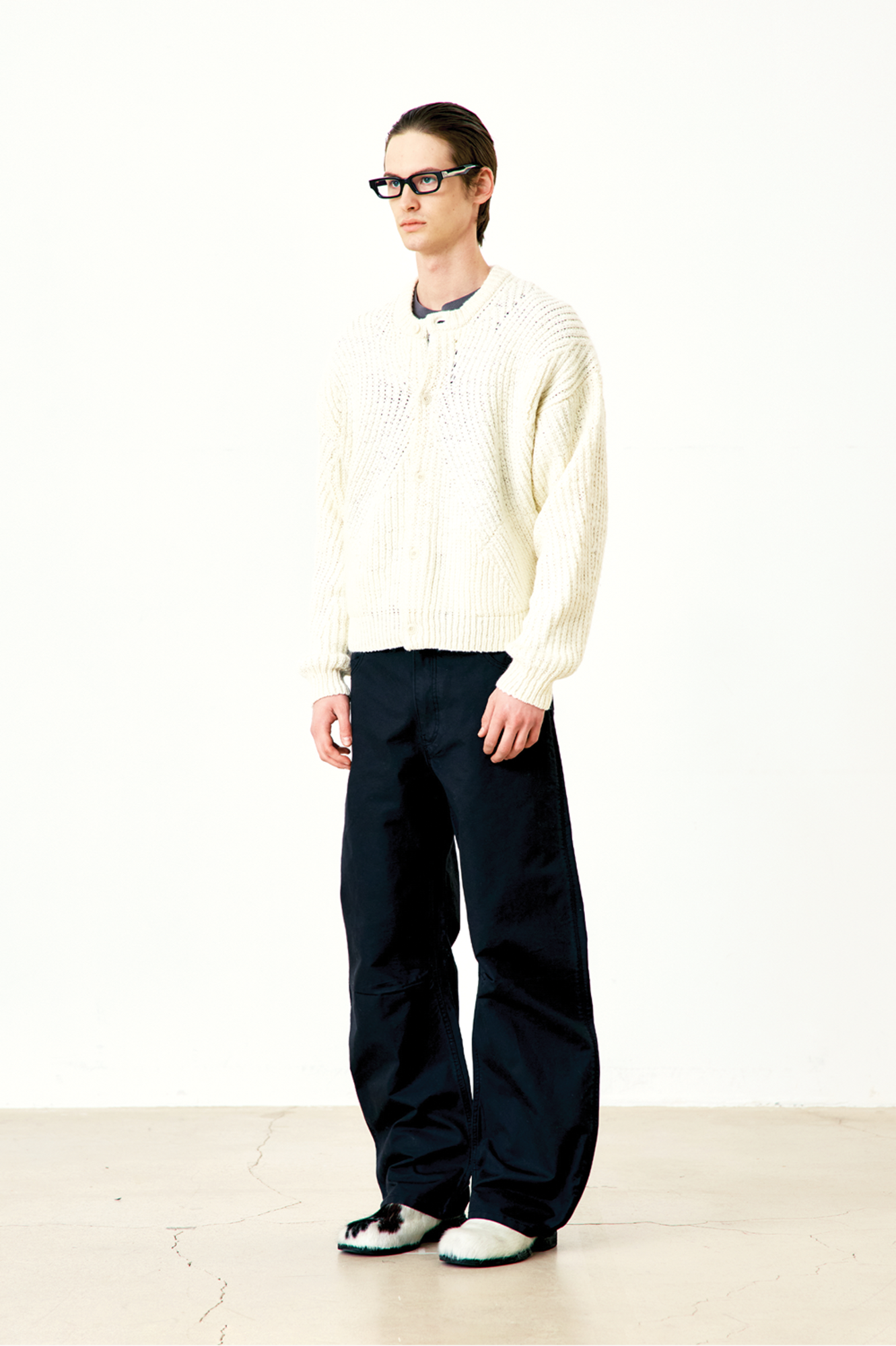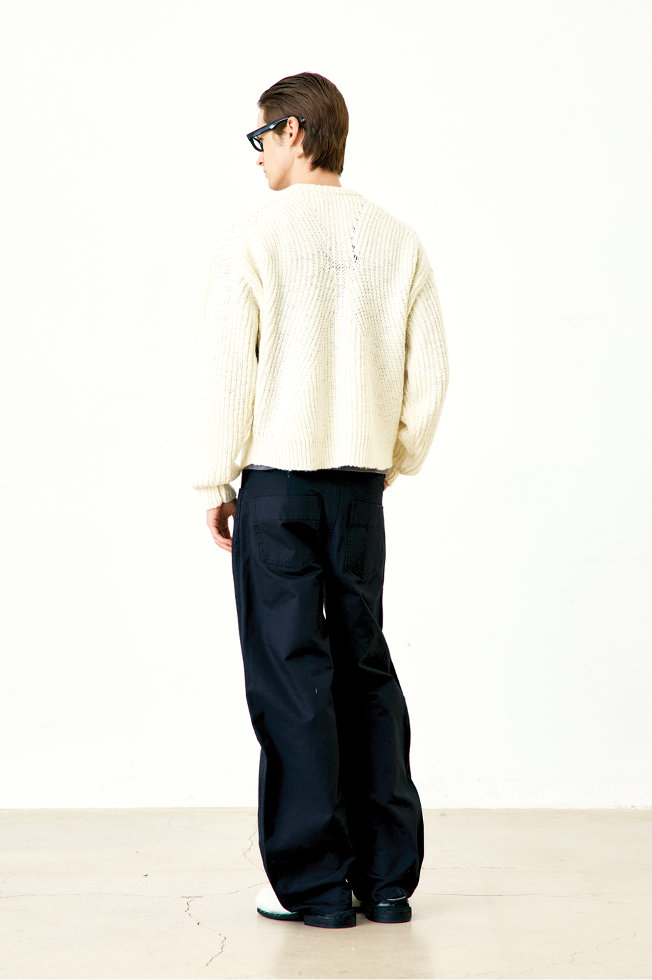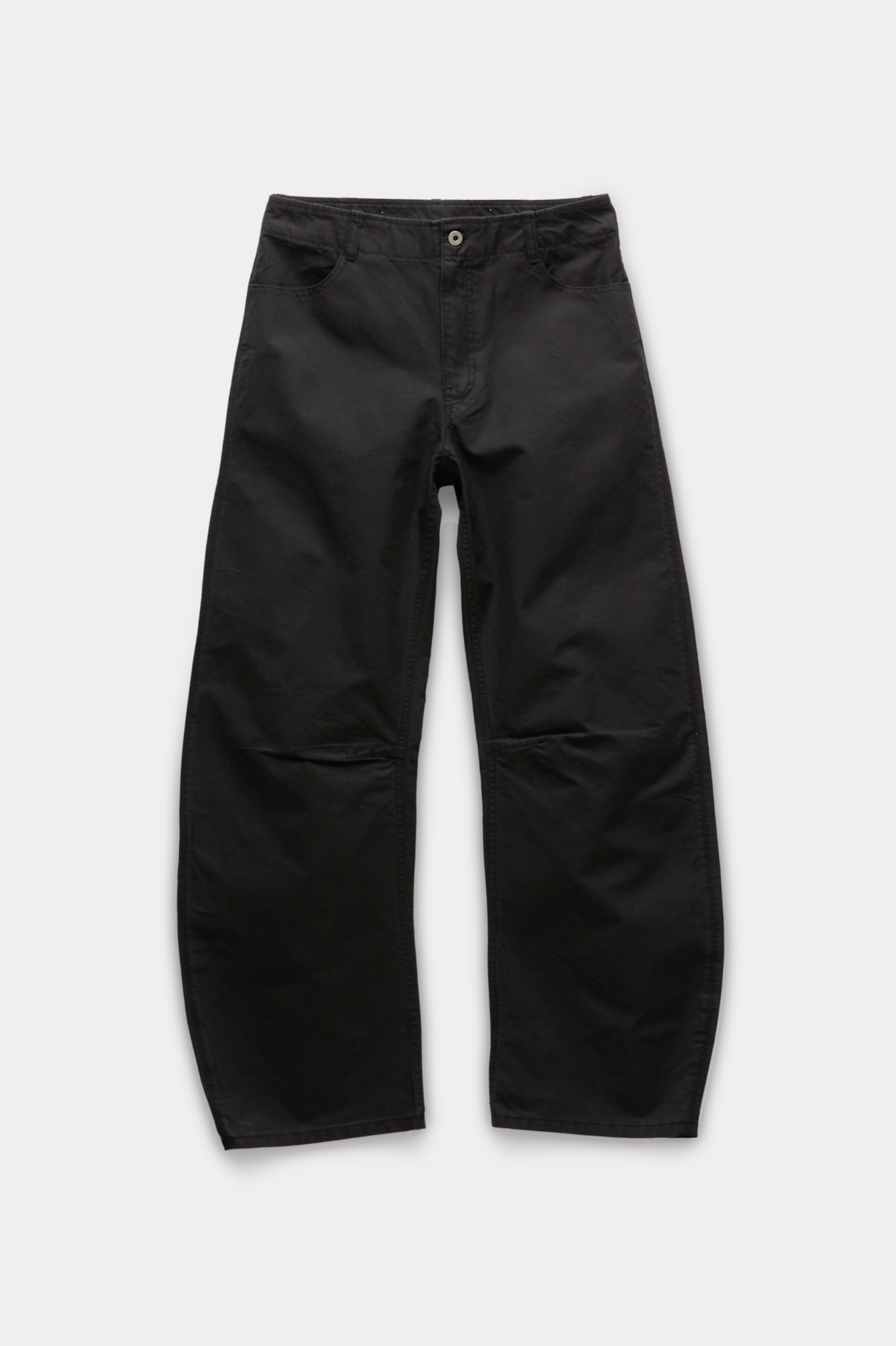 A statement wide-leg pant defined by a deep-curved silhouette and structured volume. Crafted from high-density cotton fabric sourced from Japan’s STYLEM and finished with bio-washing for a subtle vintage effect.