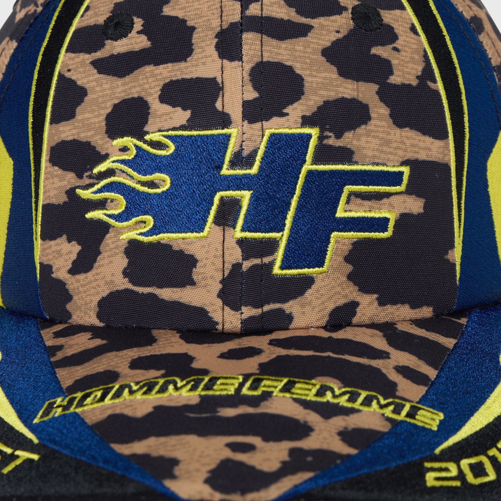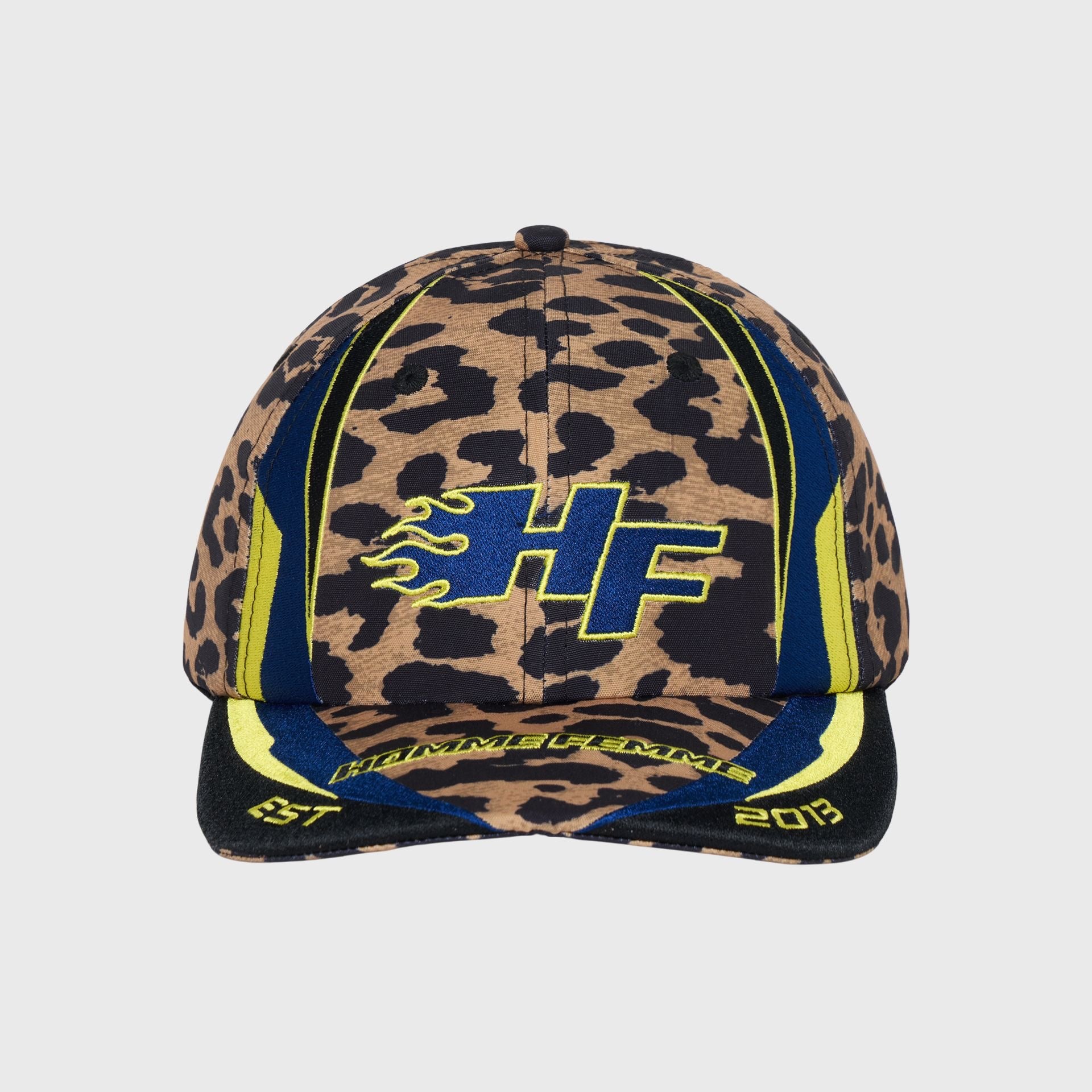 Turn heads with the Homme+Femme Blaze Racing Cap, featuring a fearless leopard print that fuses street-luxury style with motorsport energy. Crafted from premium cotton twill, this cap showcases the bold HF flame logo in electric blue and neon yellow embroidery, racing-stripe inspired panels, and a curved brim detailed with signature Homme+Femme accents.