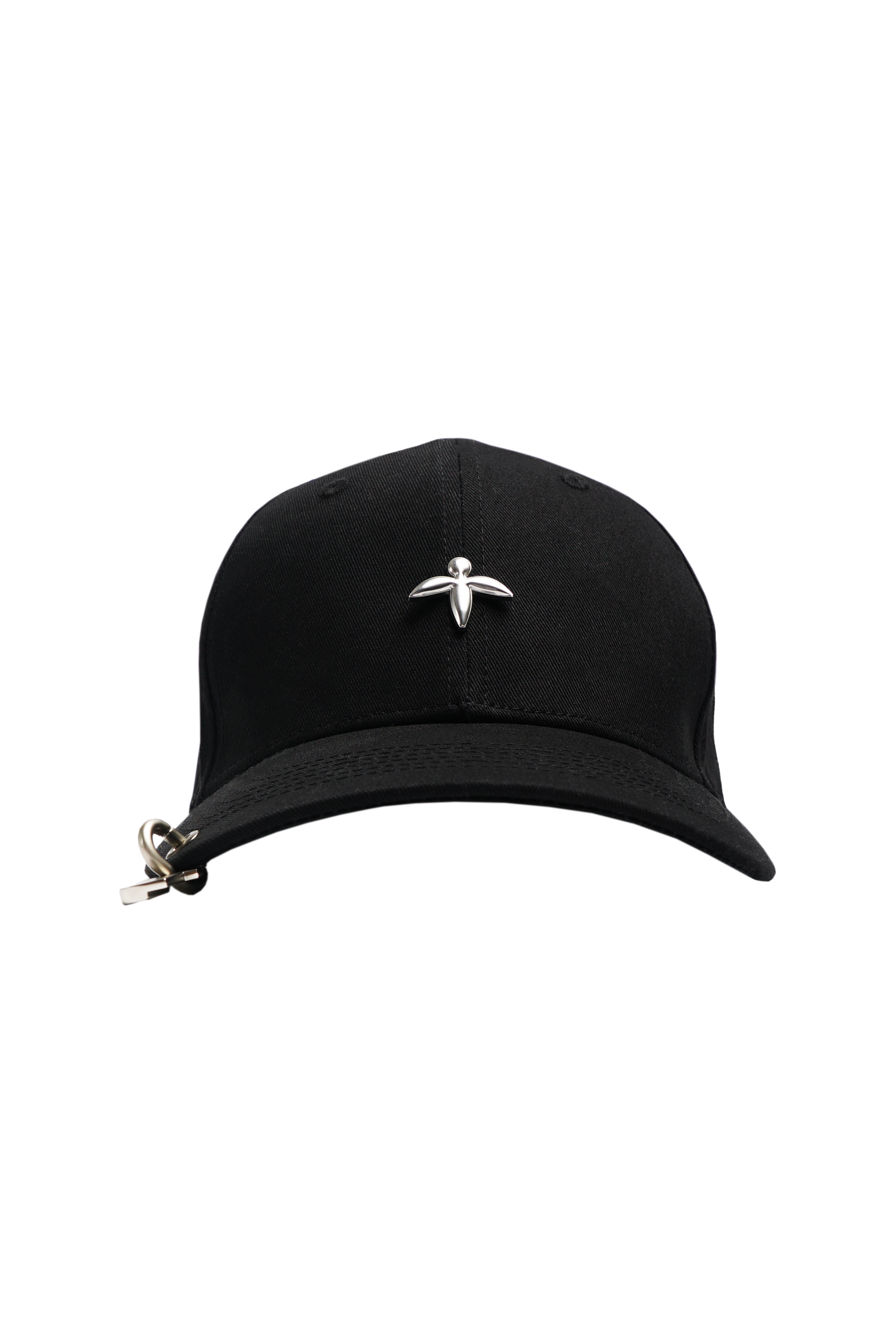 black cap with a metal logo on the middle and a black customized TorbaStudio buckle on the back and a logo metal loop