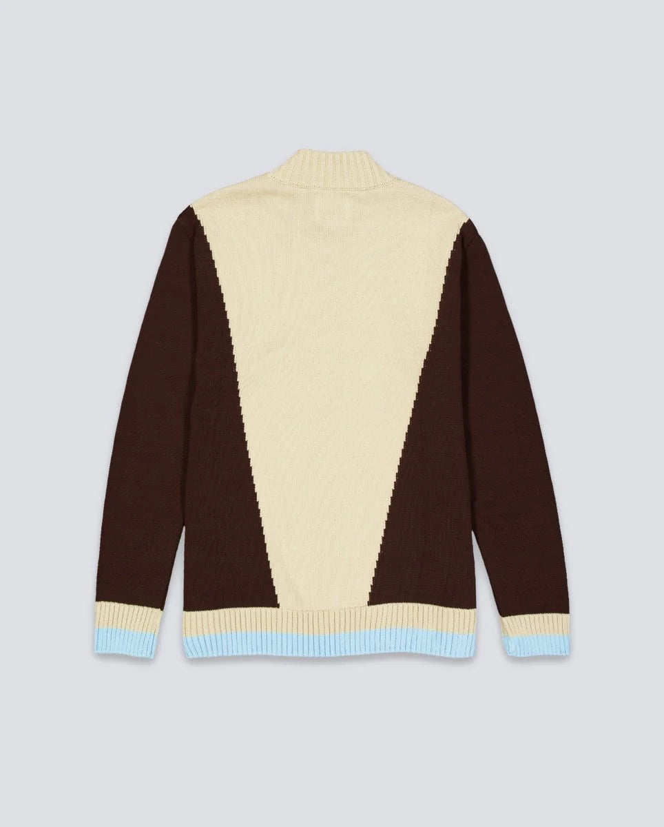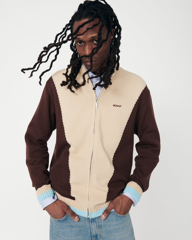 The Sport WANF Knit Jacket blends retro sportswear attitude with a modern knitwear edge. Crafted from a soft yet structured cotton knit, it features bold cream and chocolate color-blocking with sky blue accents at the cuffs and hem. Designed with a full-zip front and ribbed finishes, this piece balances comfort with a clean, statement look. Finished with subtle WANF embroidery at the chest for a quiet but confident touch.