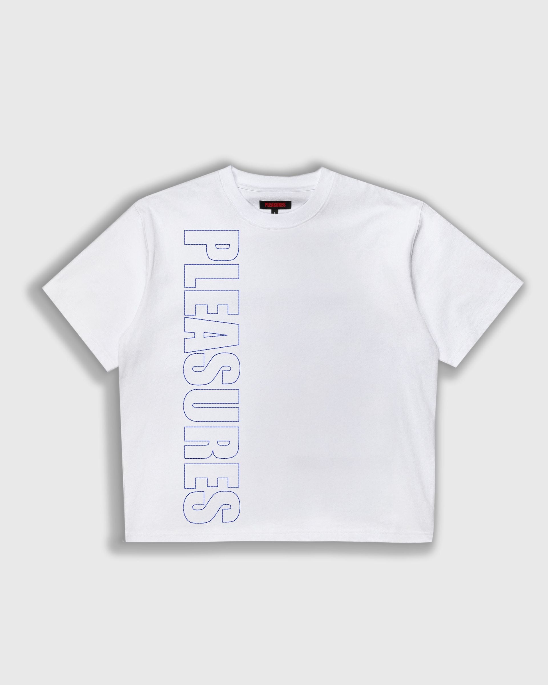 Minimalism meets bold design with the Pleasures Outline Heavyweight T-Shirt. Crafted from 100% premium cotton, it features a relaxed, oversized fit and a reinforced round neck for lasting comfort. A vertical "PLEASURES" stamp runs down the front and back, giving this tee a distinctive, street-ready look. Perfect for pairing with casual or layered outfits, it’s a versatile addition to any wardrobe.