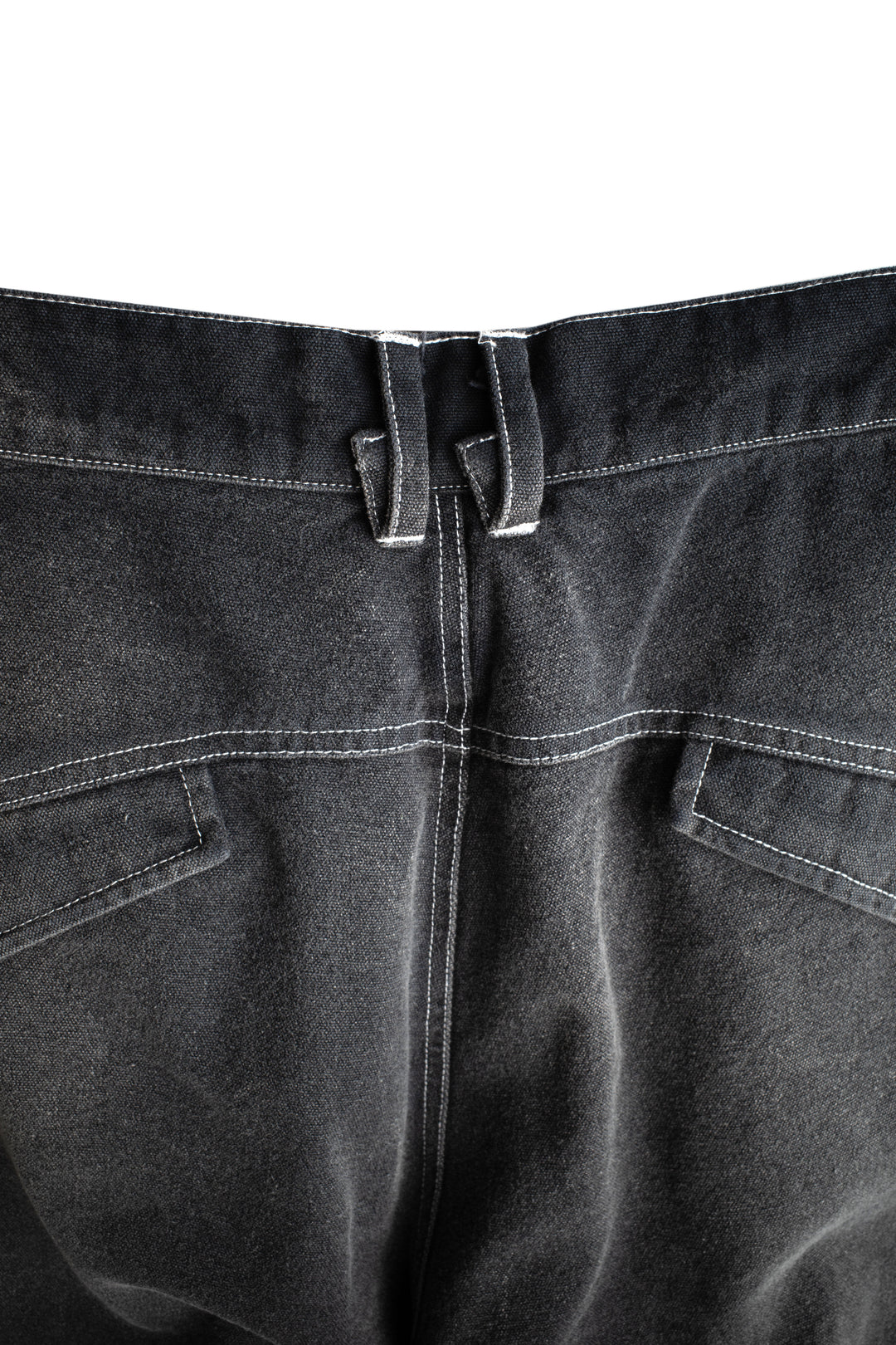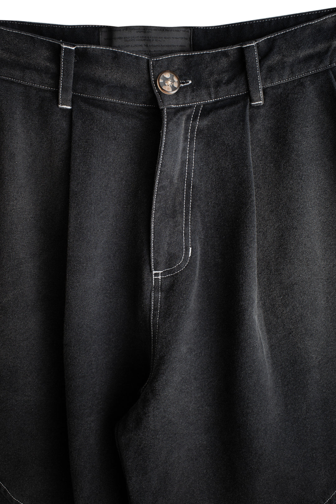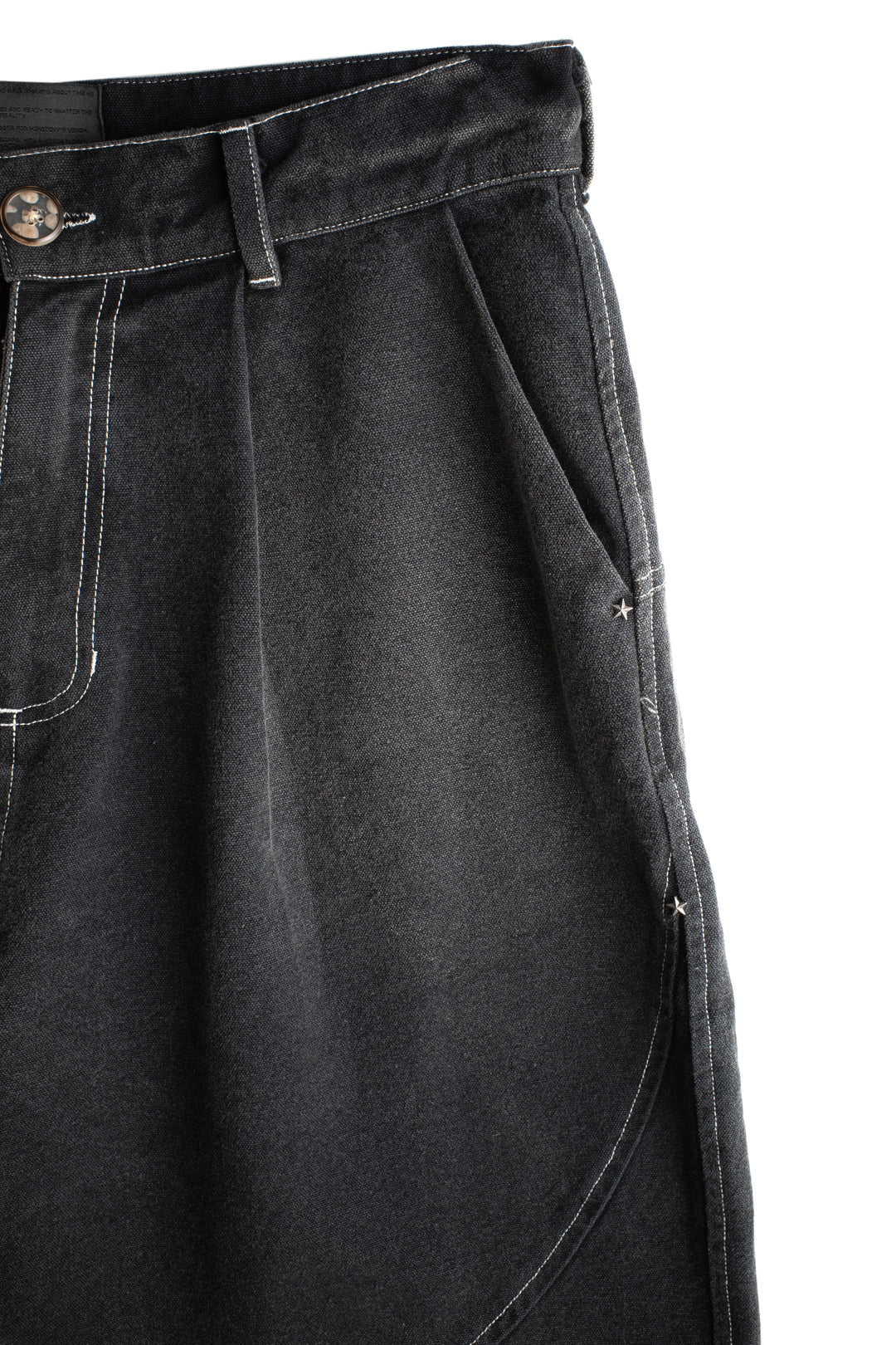 The DENIM SLANT PANT in Washed Black is designed for a bold, relaxed style. Crafted from 100% heavy-weight cotton canvas with sun-bleached fading and contrast stitching, these pants make a statement with a super wide, baggy fit. Featuring deep front pleats and a slanted knee panel for structure and shape, they combine comfort with modern streetwear aesthetics. Perfect for layering or pairing with tees and tanks, these pants deliver effortless style with every wear.