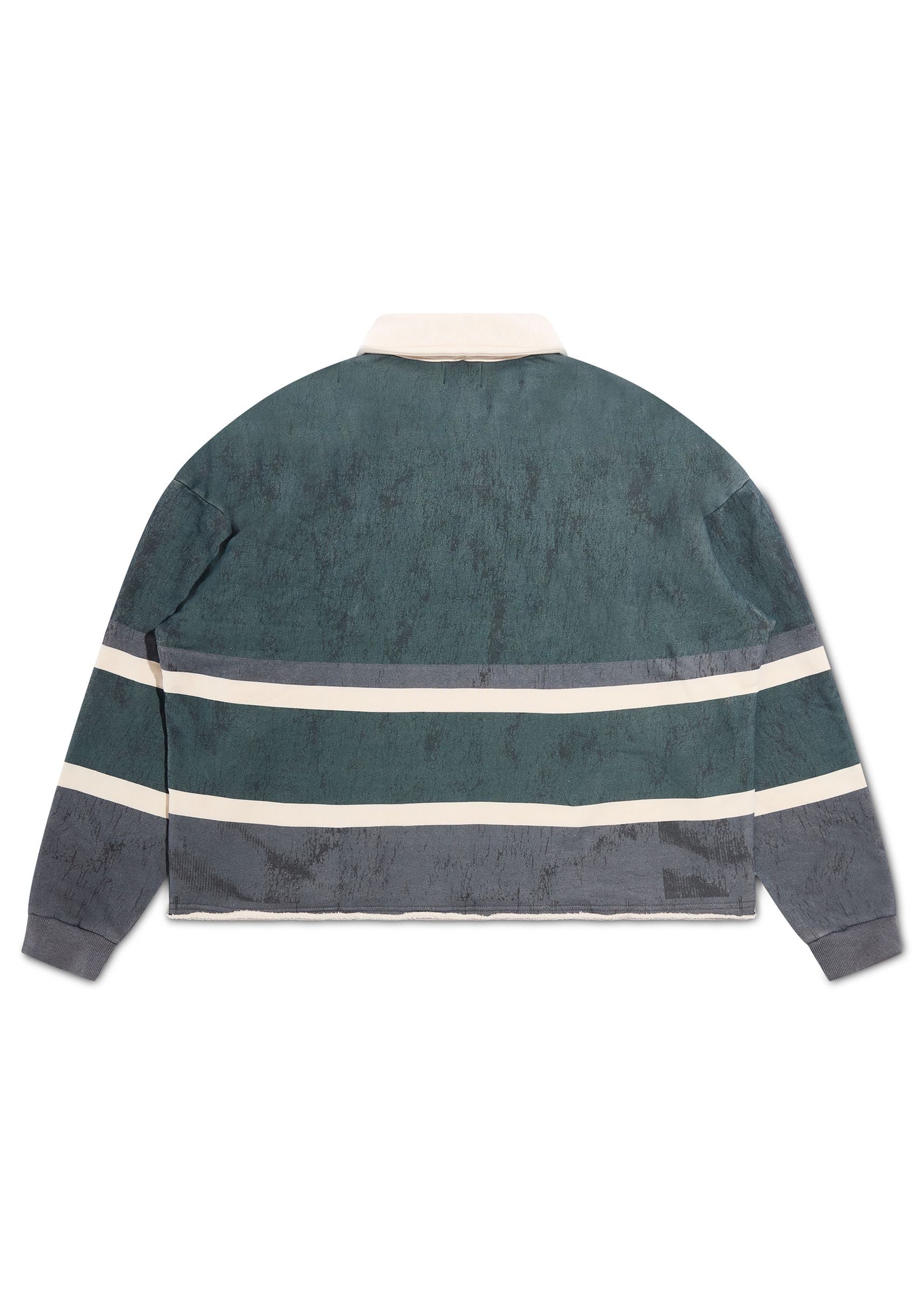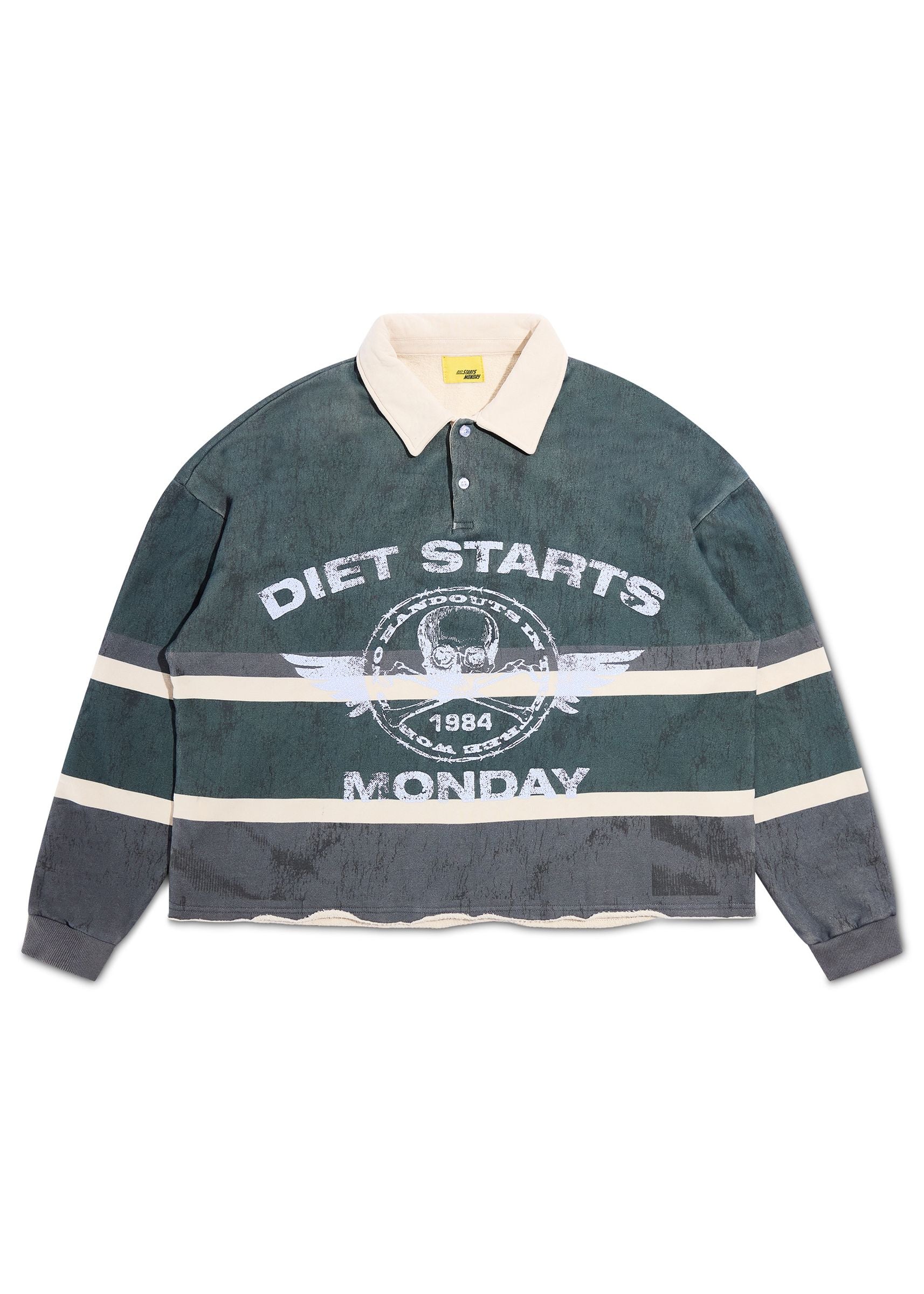 Redefine your street style with the Diet Starts Monday Free World Rugby. Built on a long-sleeve rugby polo silhouette, this piece blends preppy heritage with modern grunge attitude. The heavily washed hunter green base gives it a true vintage feel, while the oversized, boxy cut, dropped shoulders, and raw-edge hem create a worn-in look from the first wear.