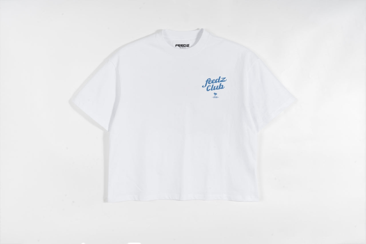 Clean, bold, and comfortable. The Zee delivers a crisp white canvas with a striking blue “Feedz Club” print on the back. Crafted from 100% cotton with a relaxed boxy fit, it’s made for those who don’t follow trends — they set them