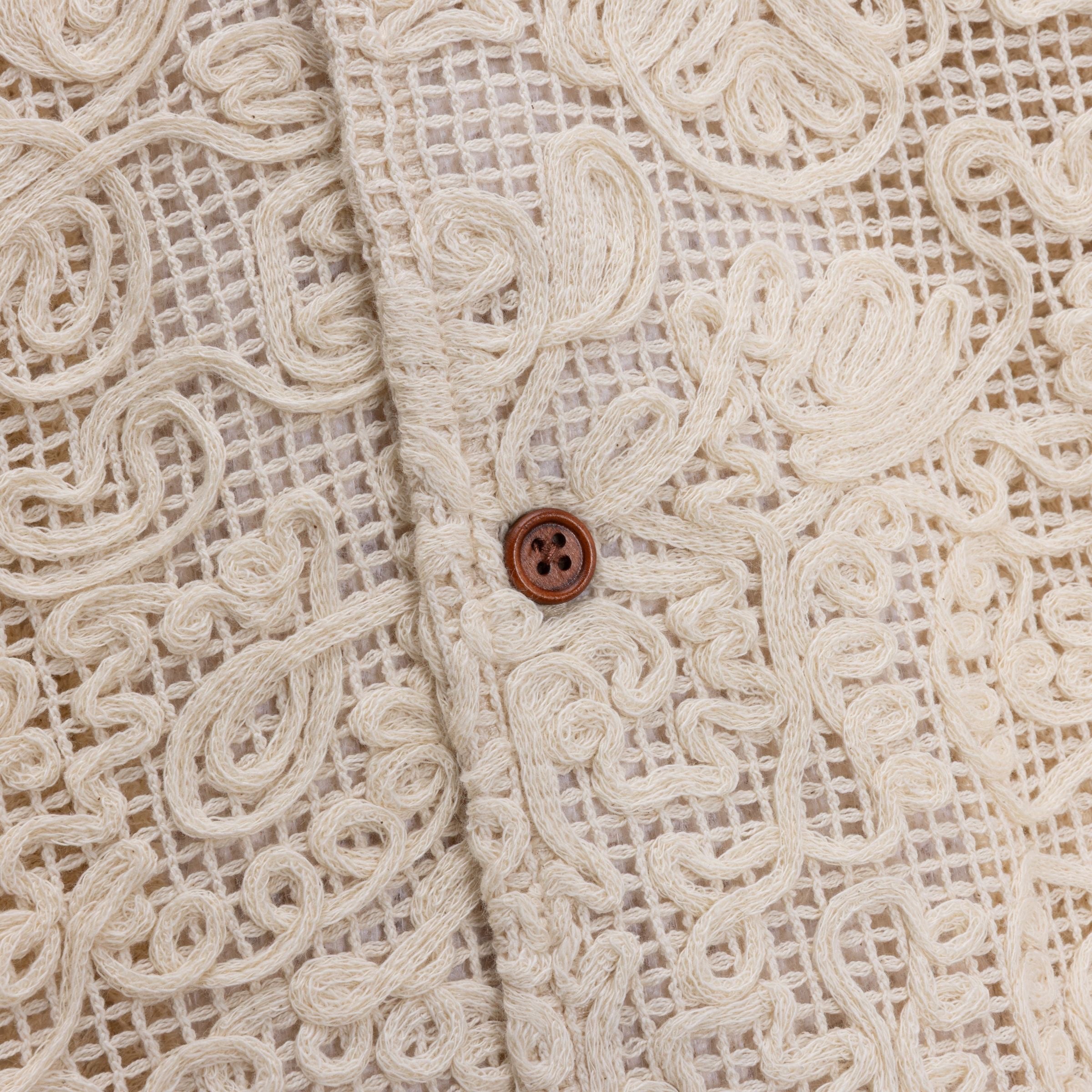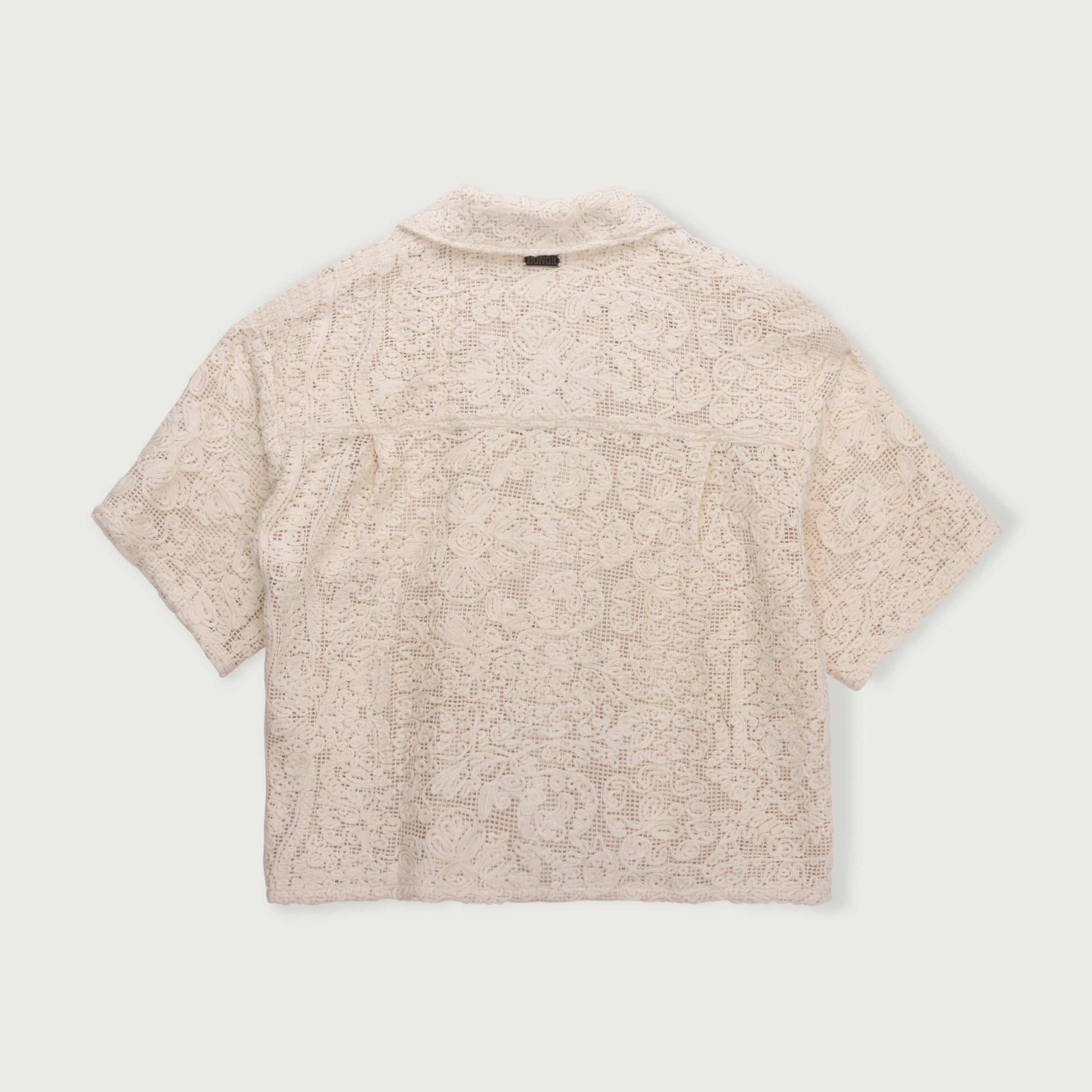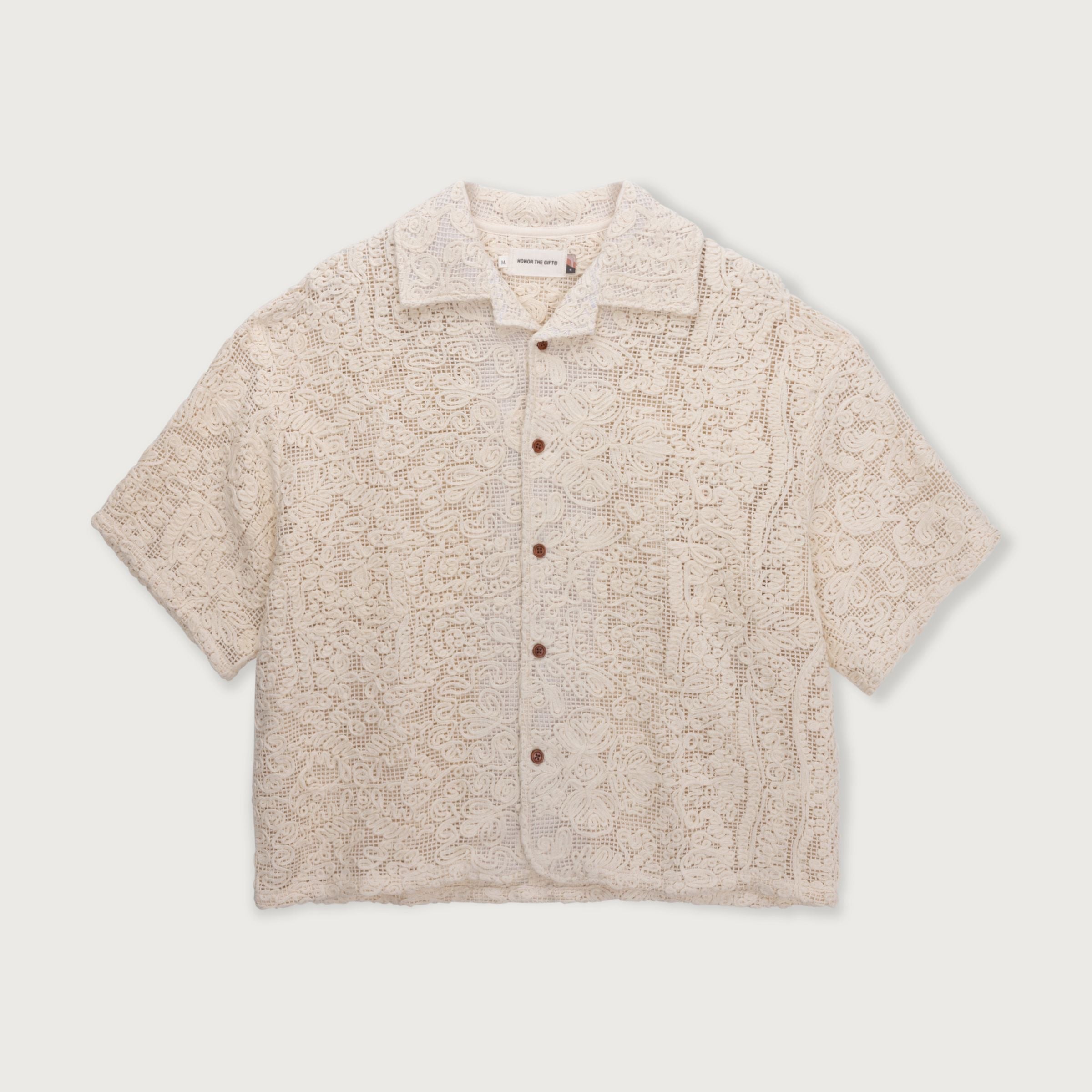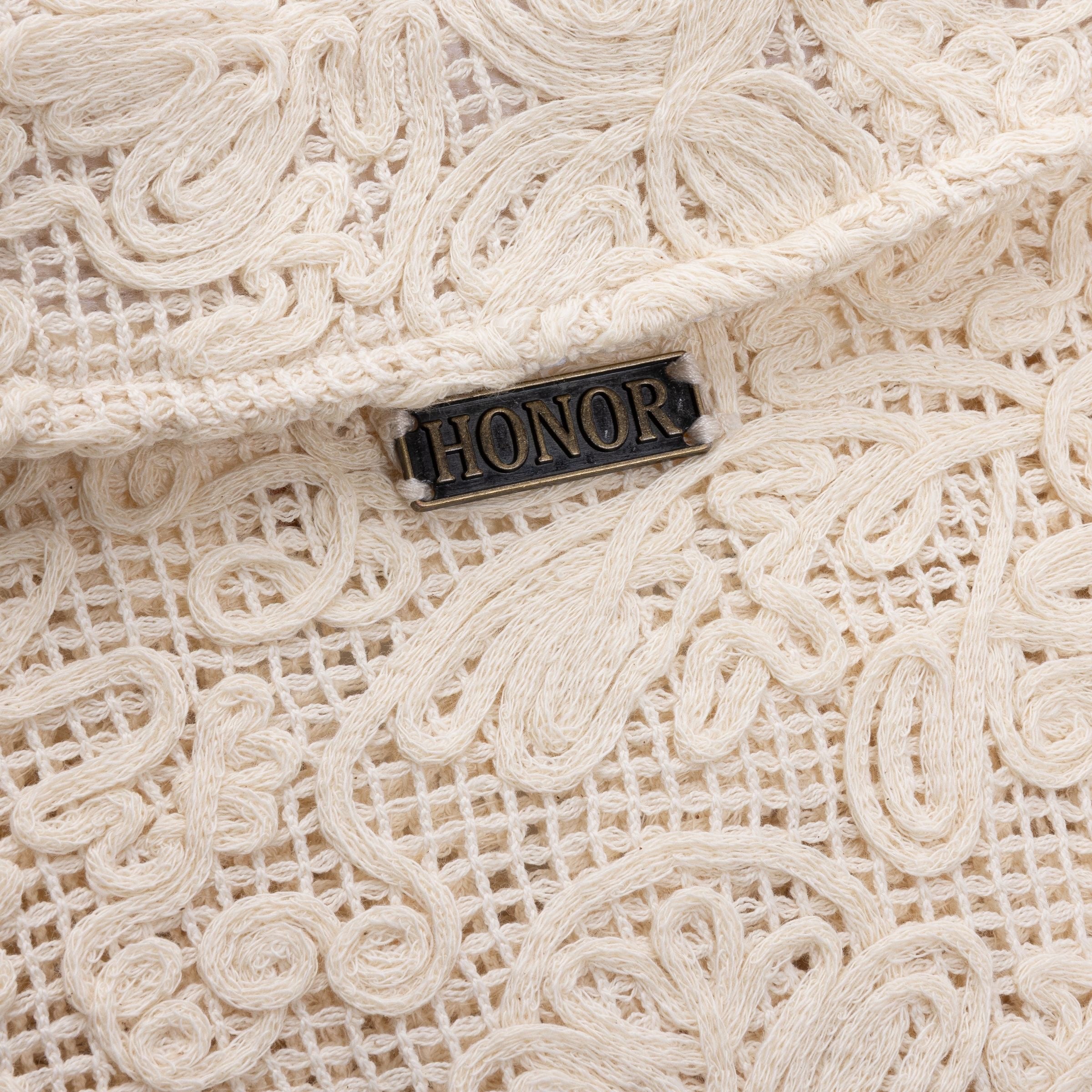 The MIND MAZE CAMP Shirt is a standout warm-weather piece designed for relaxed, modern streetwear. Crafted from heavyweight embroidered lace and mesh, it features a breathable open-knit base and a boxy, camp-style silhouette. The intricate floral and swirling embroidery adds texture, while wood-tone buttons and a custom “HONOR” metal plaque give it premium detailing. Perfect layered over a tank or worn on its own, it combines artisanal style with everyday comfort.