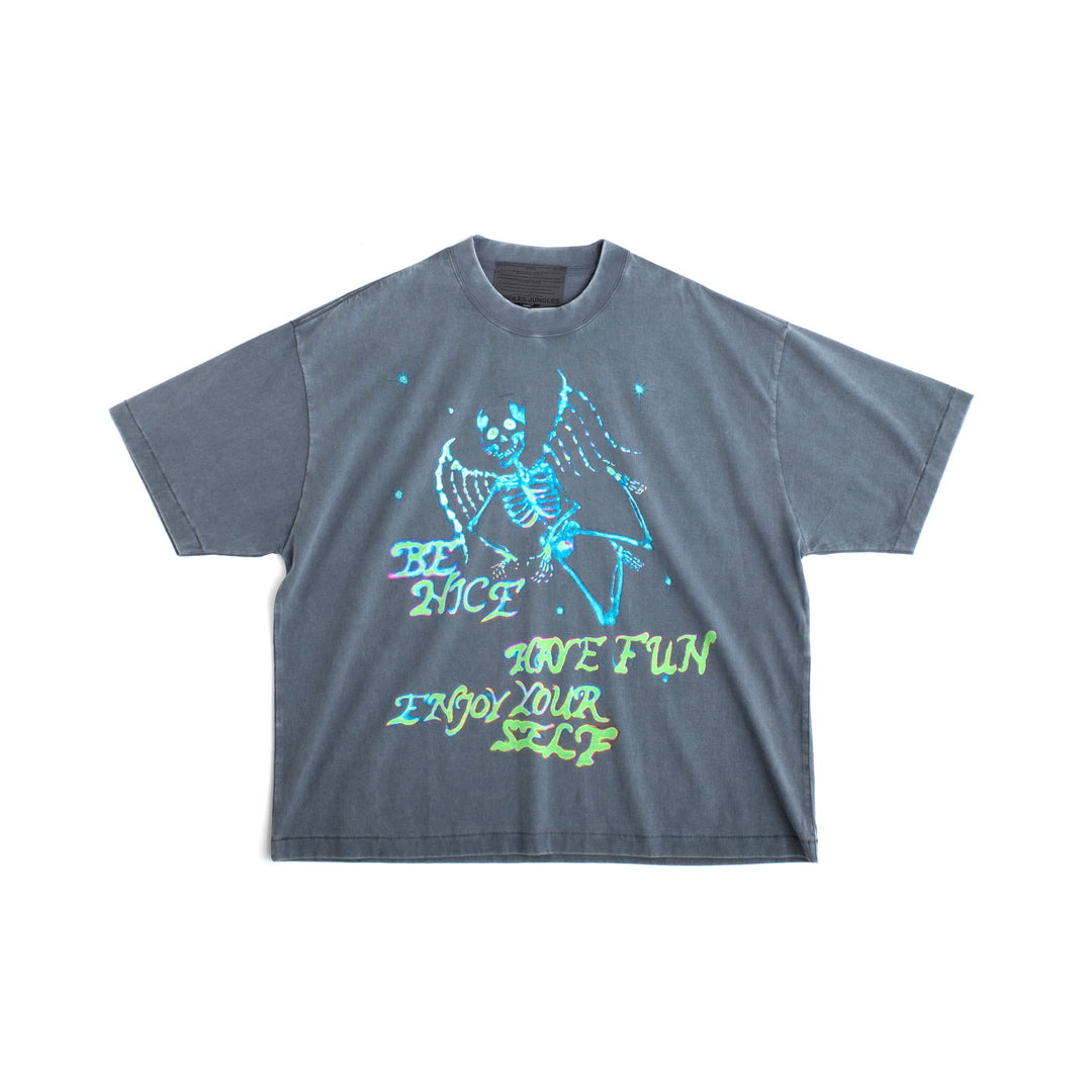 “Be nice. Have fun. Enjoy yourself.” The Jungles Jungles Enjoy Yourself Tee brings this message to life with a heavy-washed, vintage blue finish for a worn-in, lived-in look. Designed with a boxy, relaxed fit and dropped shoulders, this tee combines comfort and street-luxury style effortlessly.