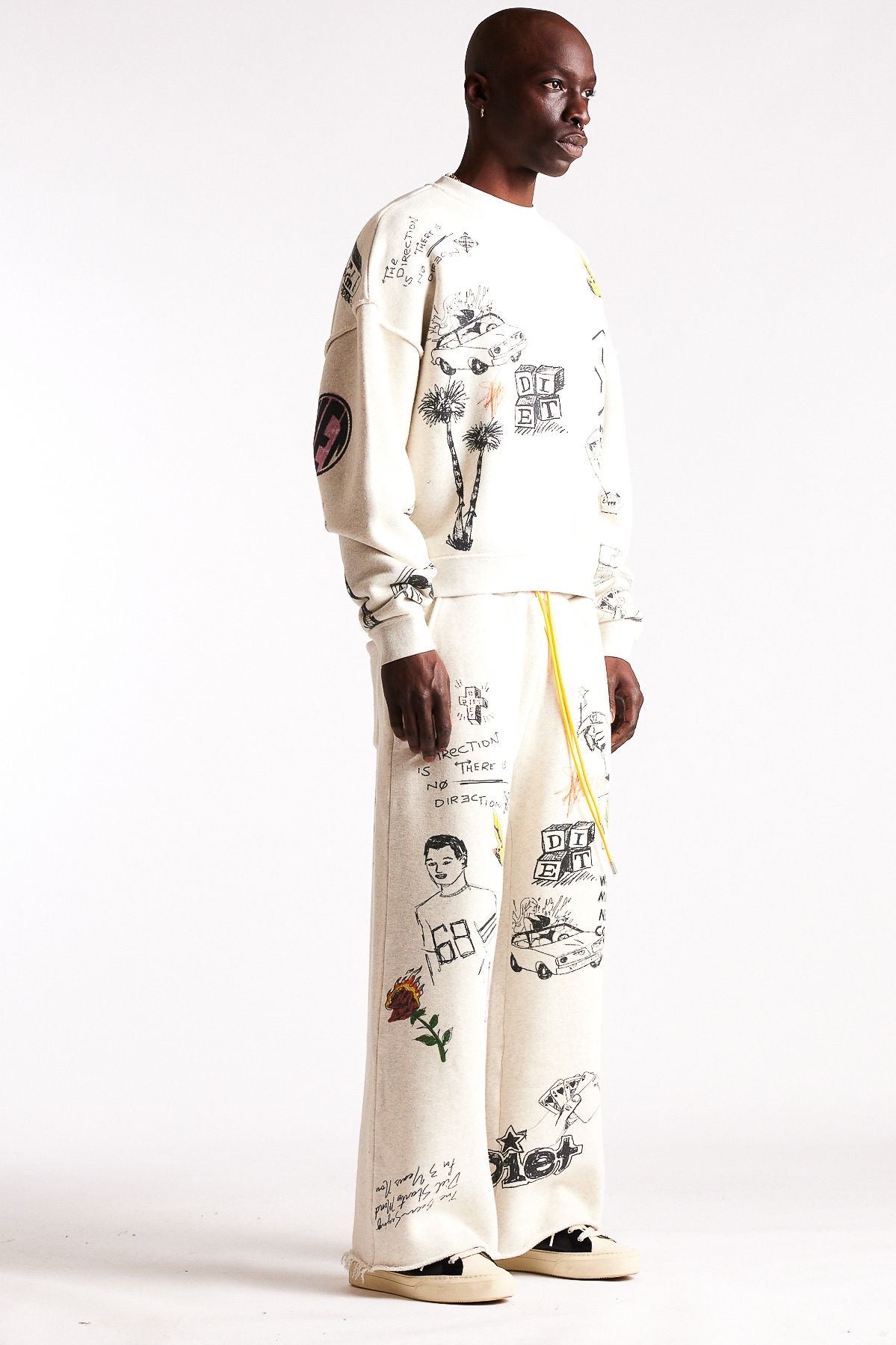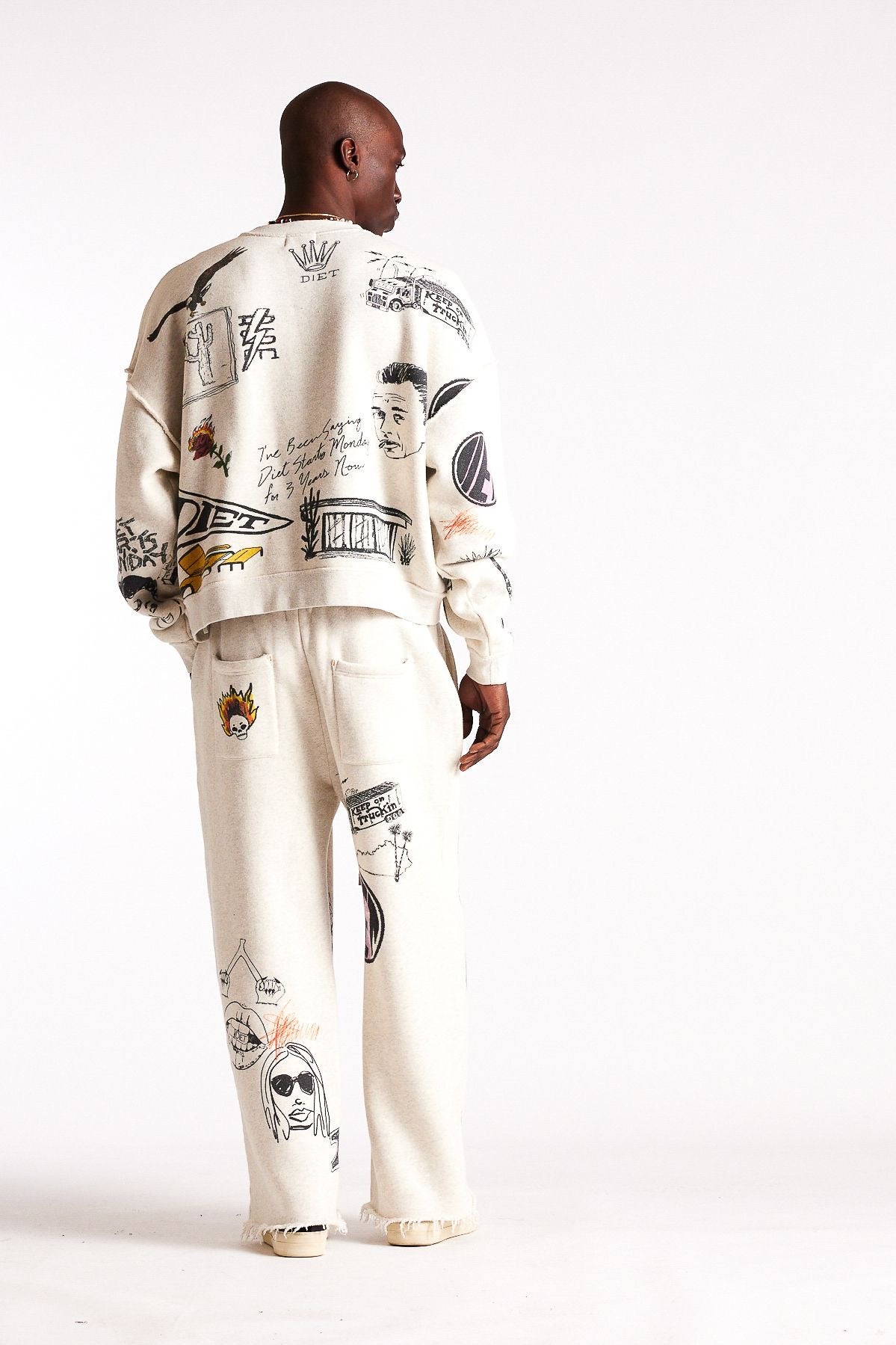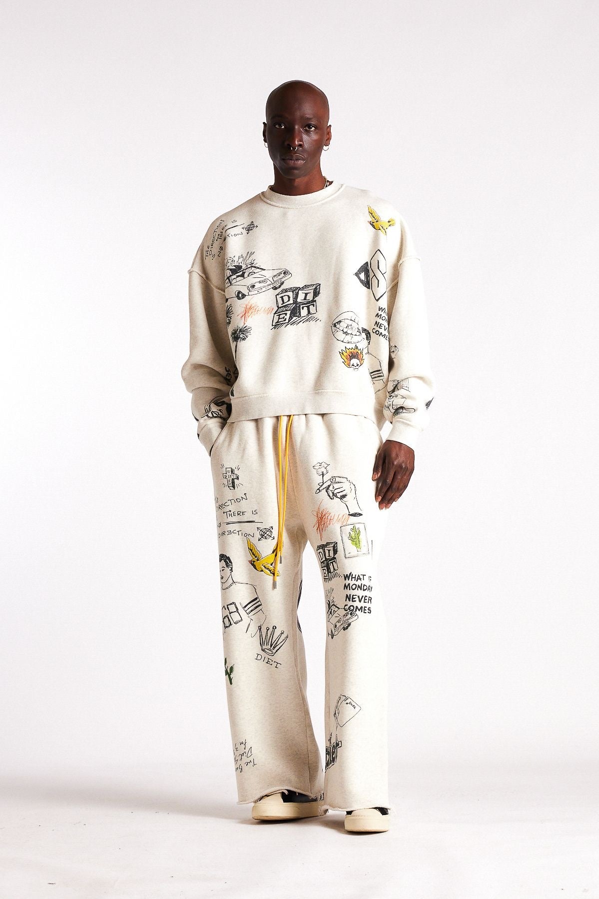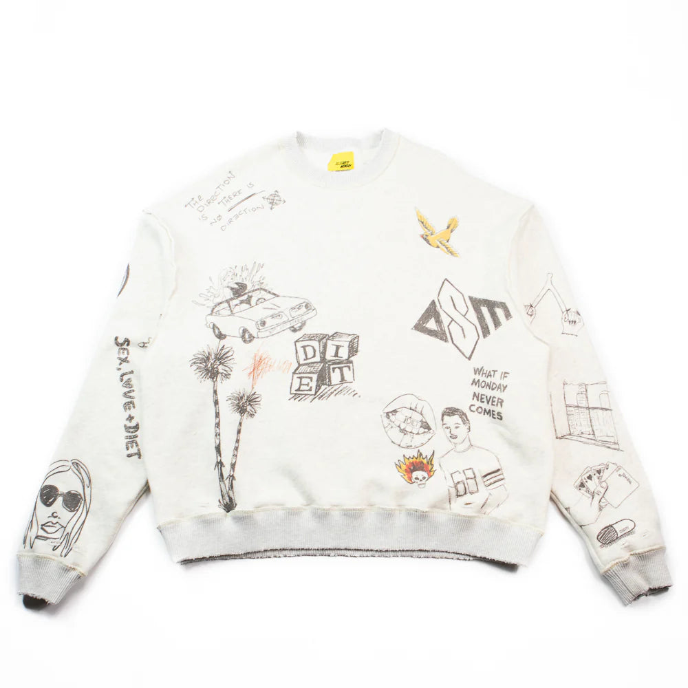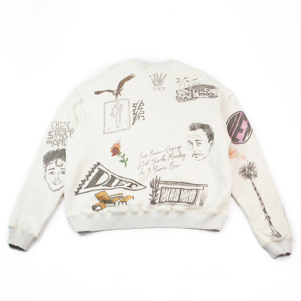 Diet Starts Monday Doodle Crewneck Sweatshirt – Heather Grey This crewneck blends comfort with bold, hand-drawn artwork that makes every piece feel one-of-a-kind. Made from medium-weight fleece, it’s soft yet durable—perfect for year-round wear. The raw hem and exposed collar give it a vintage edge, while the all-over doodle graphics...