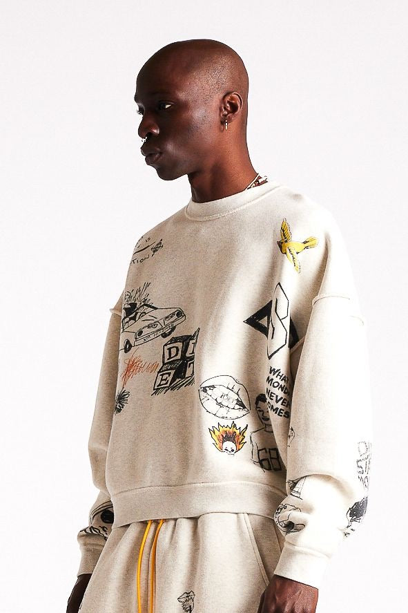 This crewneck blends comfort with bold, hand-drawn artwork that makes every piece feel one-of-a-kind. Made from medium-weight fleece, it’s soft yet durable—perfect for year-round wear. The raw hem and exposed collar give it a vintage edge, while the all-over doodle graphics bring personality and attitude from every angle.