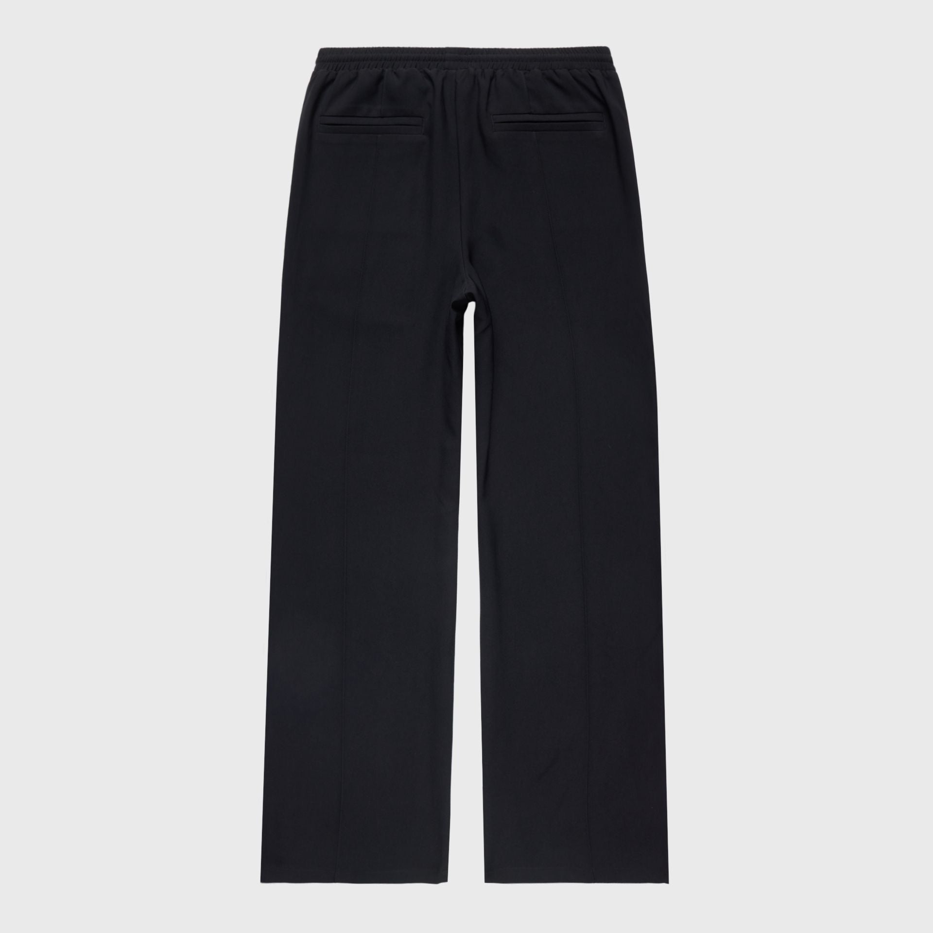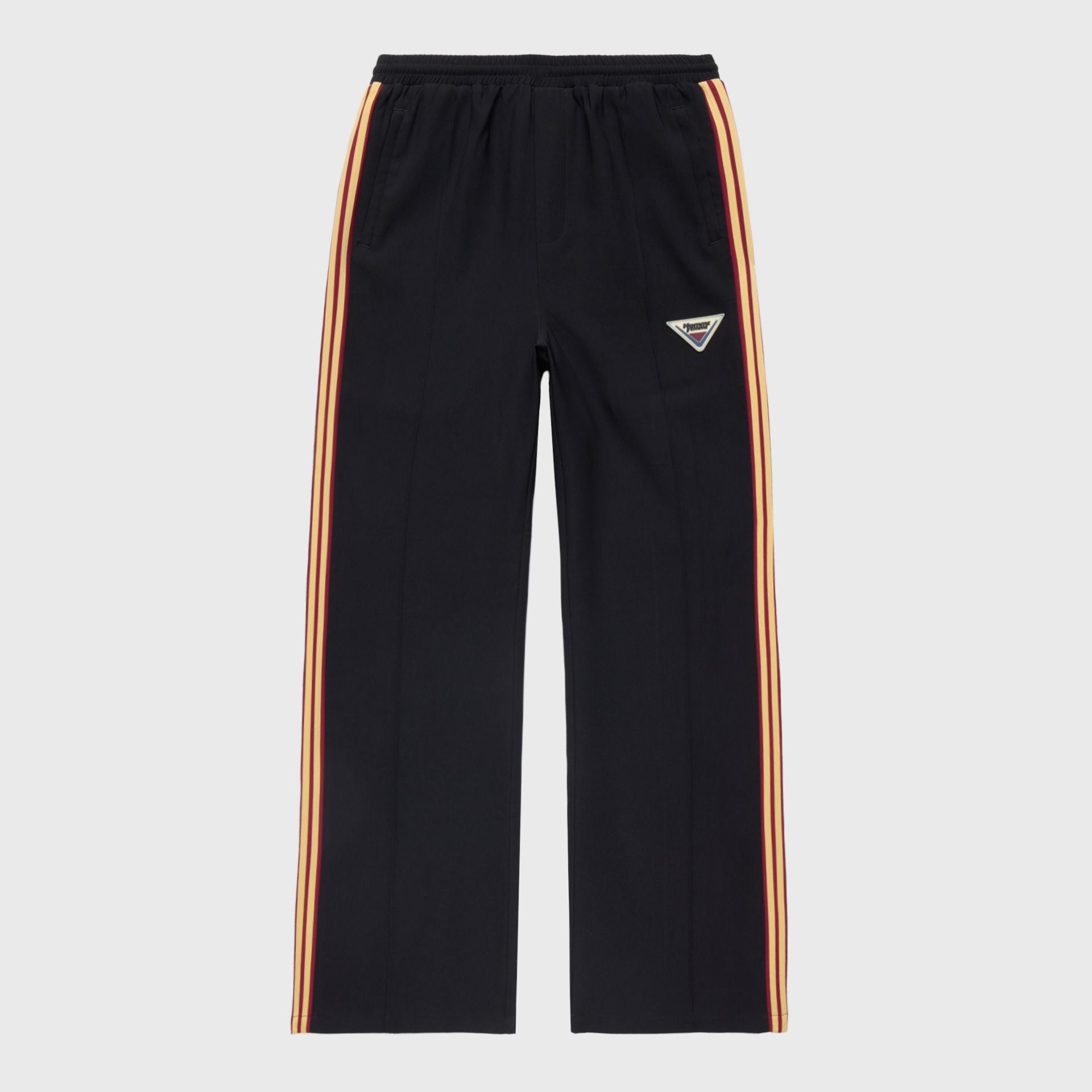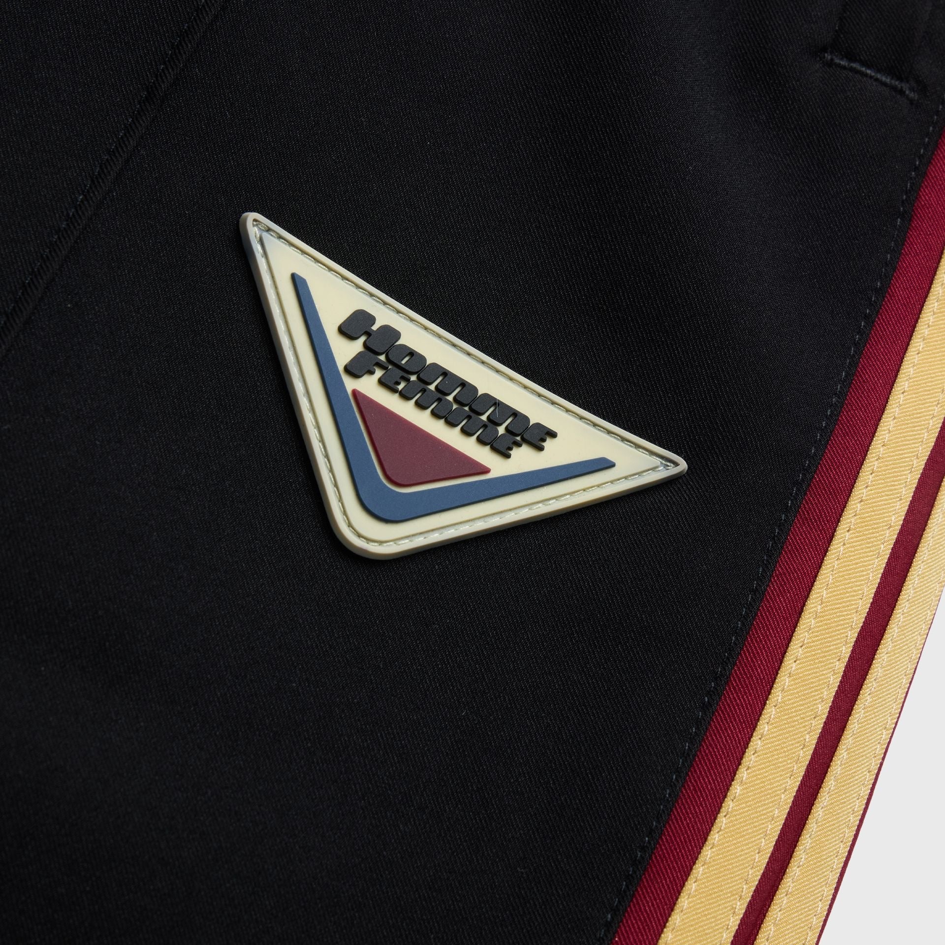 Luxury sportswear adapted for the street. The HOMME FEMME Classic Track Pants come in jet black with red panels and gold racing stripes, bringing heritage athletic style into a modern street-luxury look. Made from a premium poly-cotton blend, they feature a relaxed straight-leg fit, an elastic waistband, side pockets, and the signature triangular Homme Femme emblem at the hip. Priced at 165 dollars, they pair perfectly with the Classic Track Jacket for a full tracksuit statement.