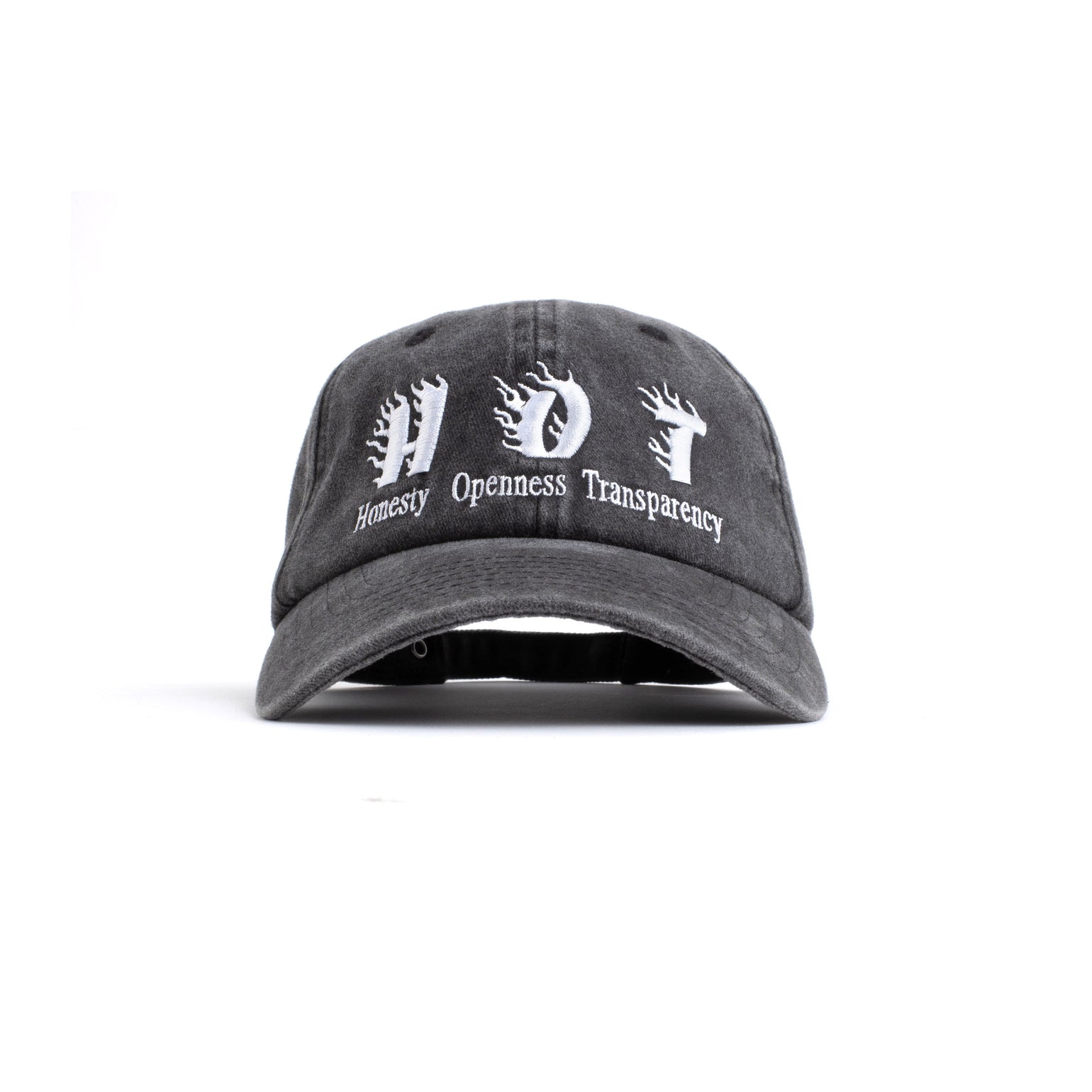 The Hot Distressed Cap carries the words “Honesty, Openness, Transparency” as a statement of intent. Made from washed cotton for a worn-in look, it features a classic 6-panel design with subtle distressing for added character.