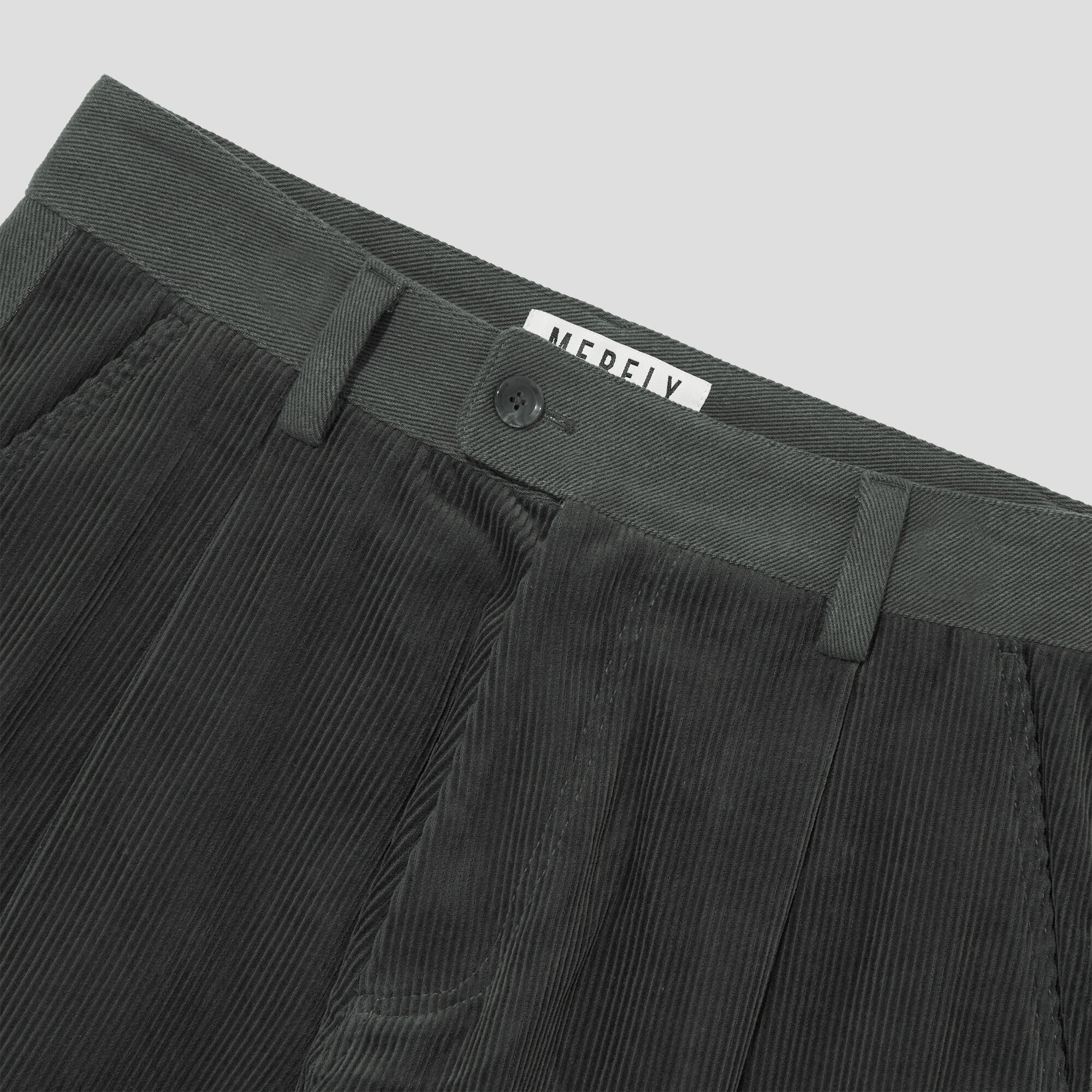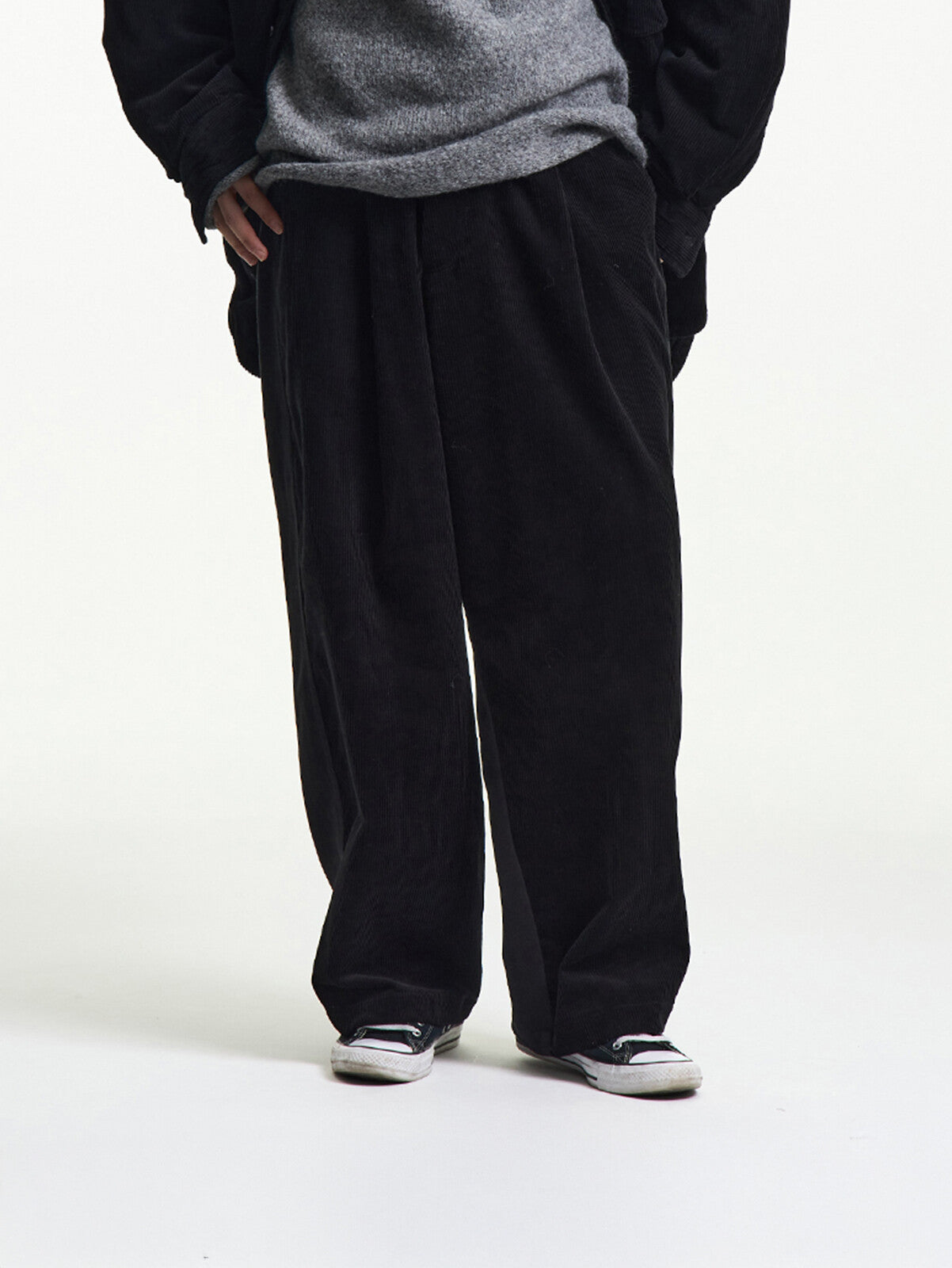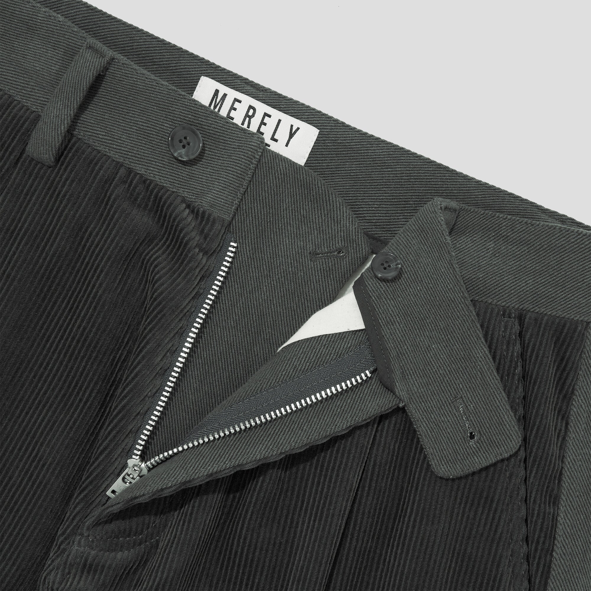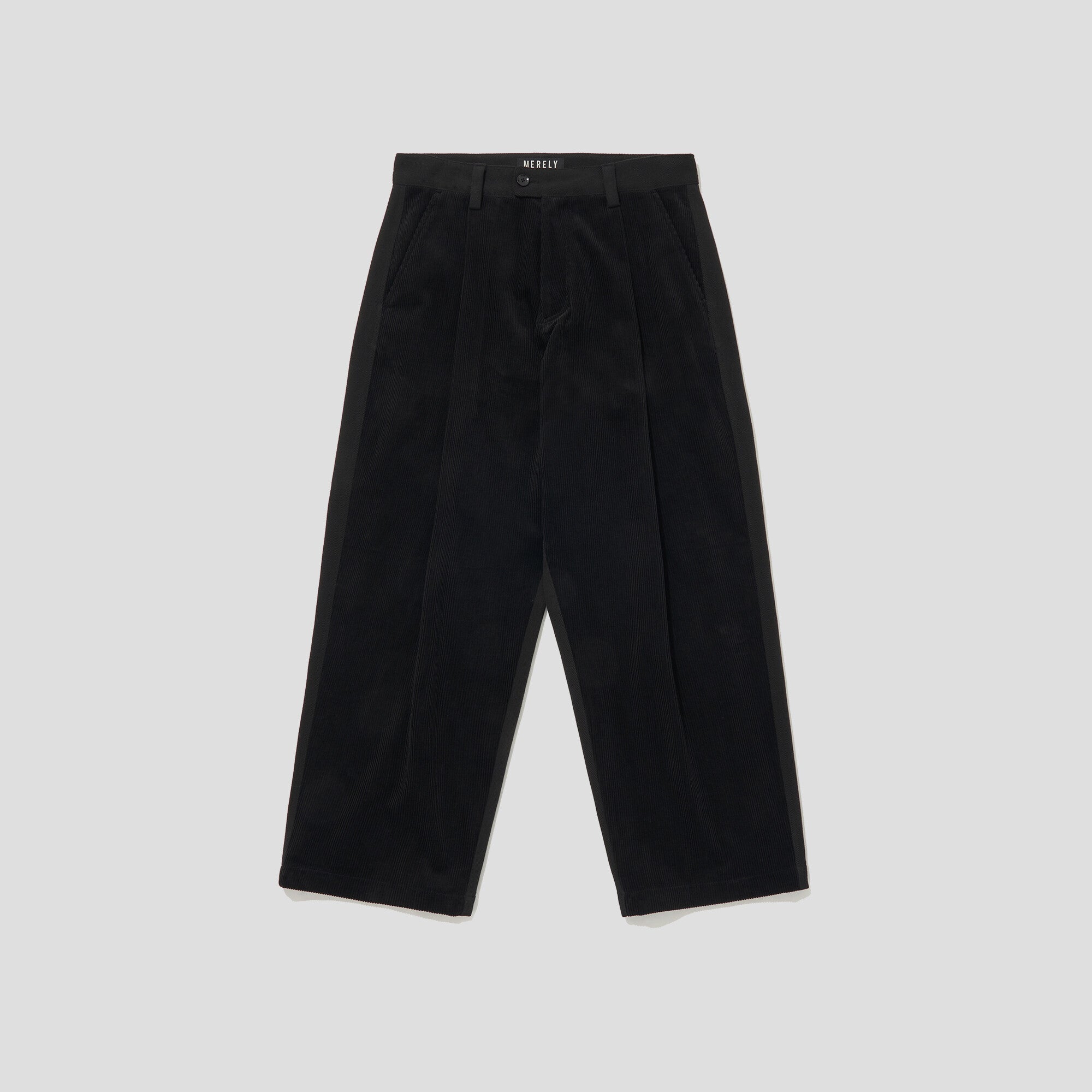 The Merely Made Premium Dual Fabric Contrast Wide Pants in Royal Black combine craftsmanship and comfort in a bold silhouette. Designed with a unique dual-fabric construction, the front features Shibaya “8 Wales” cotton-dyed corduroy, while the back is made from durable 6’s bio-washed cotton twill. A gabardine twill lining adds structure and smooth finish.