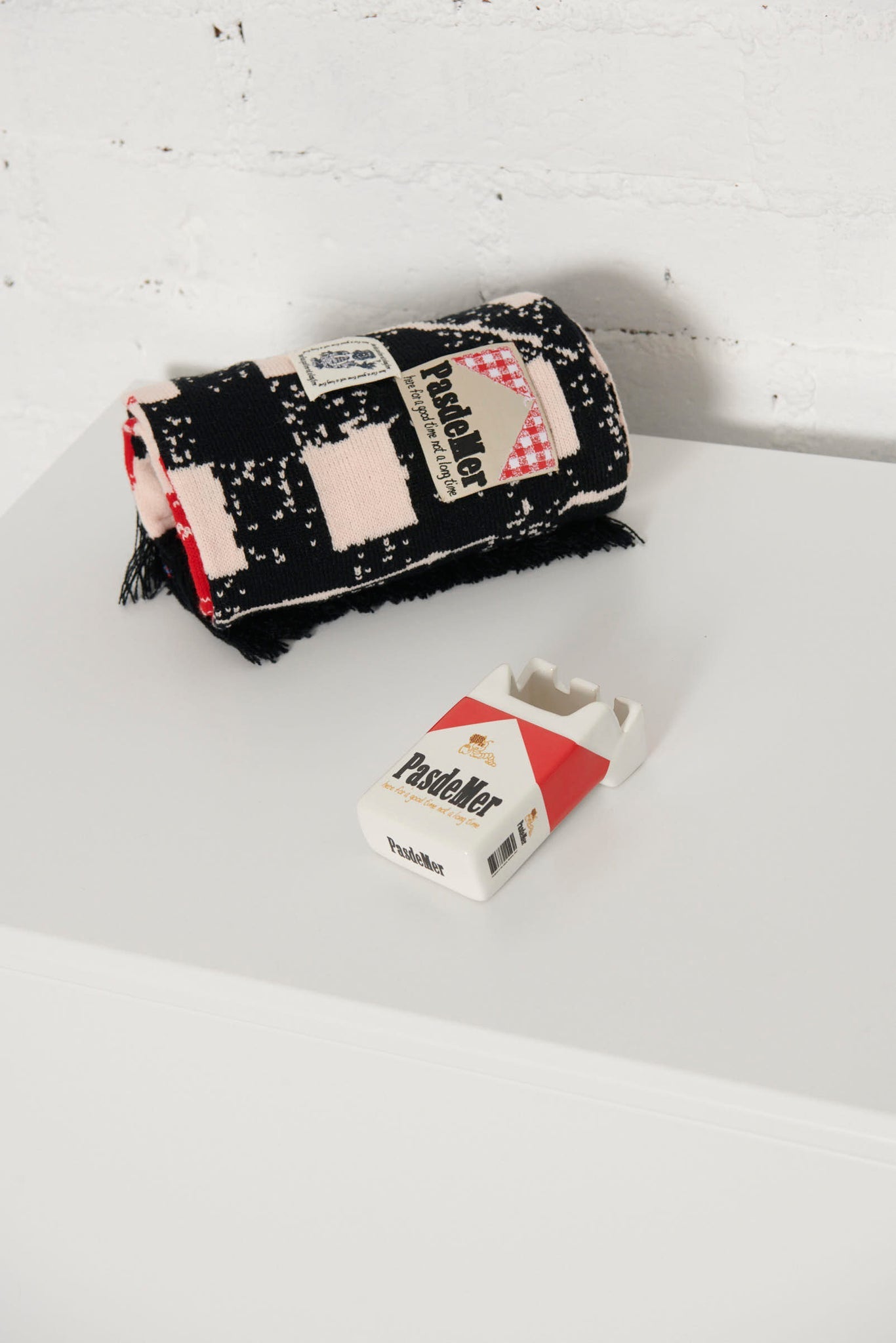 The Pas de Mer Not Long Time Ashtray brings humor and style into your space. Crafted in ceramic with a glossy finish, it takes the shape of a playful cigarette-pack silhouette. Finished with an all-over red and white print, it carries bold Pas de Mer branding and slogan detailing, making it both functional and visually striking.
