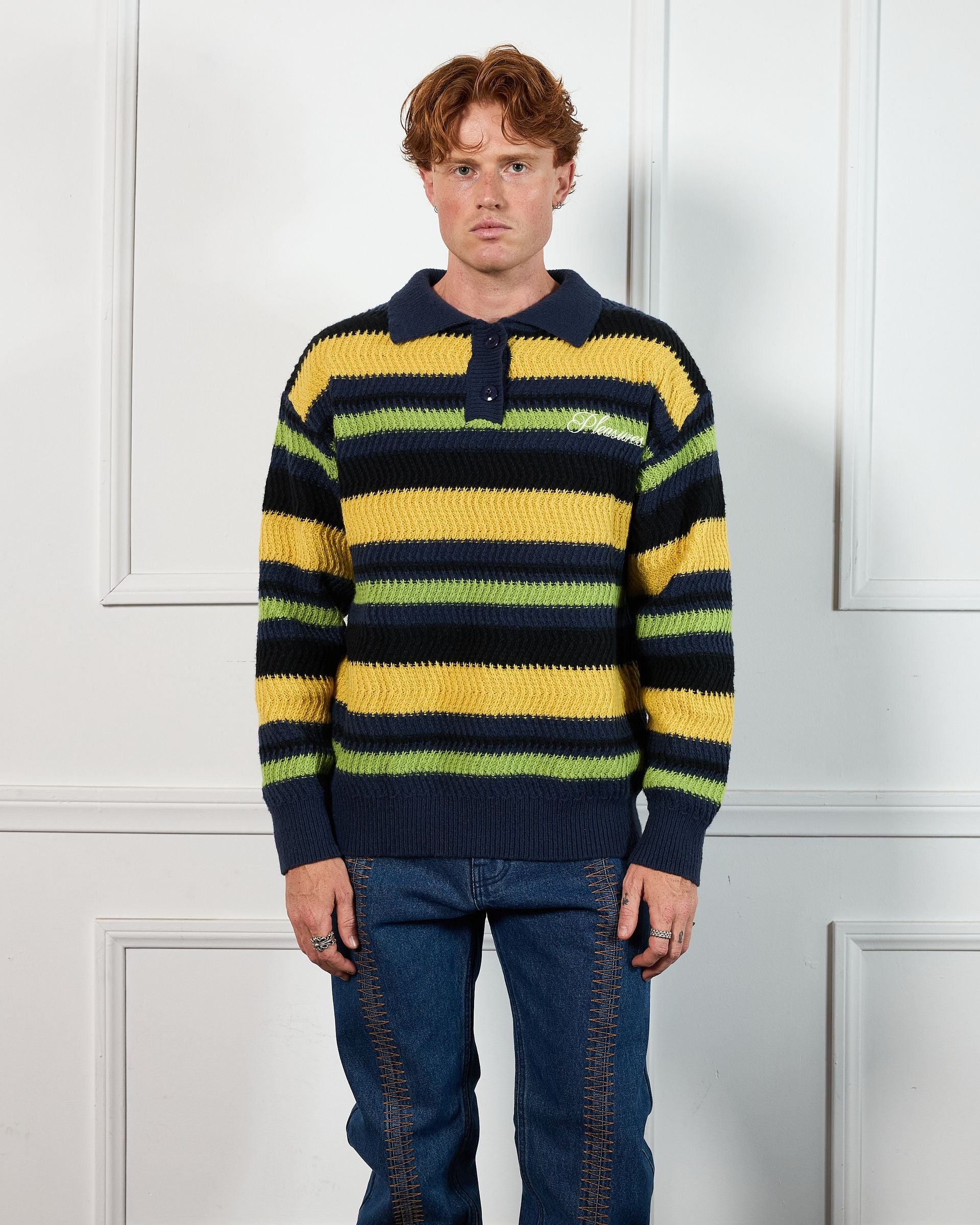 Pleasures Cooper Polo Sweater – Yellow A refined take on classic knitwear, the Pleasures Cooper Polo Sweater combines style and comfort. Made from 100% 7-gauge yarn, this full-fashion knitted sweater features an intarsia stripe design for a timeless look. Ideal for layering or wearing solo, it brings a smart, street-ready...